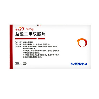 产品名称 格华止 通用名:盐酸二甲双胍片 剂型:片剂/盒 规格:0.85g*30片 零售价:56.50元/盒 会员价:55.00元/盒 生产企业:法国MERCK SANTE |
